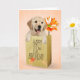 Cute golden retriever in a generic brown paper bag with orange gerbera daisy for 102nd birthday.
