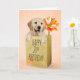 Cute golden retriever in a generic brown paper bag with orange gerbera daisy for 20th birthday.