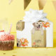 Cute golden retriever in a generic brown paper bag with orange gerbera daisy on white background.