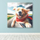 A joyful Golden Retriever with a red bandanna around its neck leans out of a car window, enjoying the wind