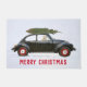 Golden retriever dog driving a retro black car in snowflakes with green Christmas pine tree on roof.