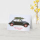 Golden retriever in old car with holiday tree card