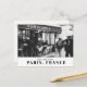 This vintage-style postcard features a black and white photograph of a charming golden retriever sitting outside a Parisian cafe on a rainy day.