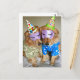 This design features a photograph of two golden retriever dogs tired after celebrating their birthday! One is dressed in green camouflage pyjamas, while the other is wearing blue pyjamas with white stars. Both are wearing party hats and purple sleep masks with black eyelashes. Text on back reads, "Hope your birthday wears you out!" but this can be changed or deleted to suit your needs.