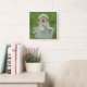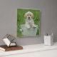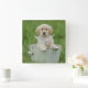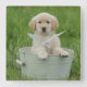 Purebred golden retrieve puppy taking a bath outdoors in a cream colored vintage washtub sitting in the grass with her paws on the edge. She is an adorable fluffy blonde fawn colored baby dog with brown eyes and a black nose.