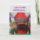 This thank you card features a golden retriever as a knight in armour, holding a sword. He has a horse and is sitting next to the castle. The outside text reads, “I won’t let another KNIGHT pass by…” and the inside text reads, “Without wishing thee a heartfelt thank you!”.