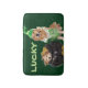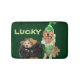 This bath mat features a golden retriever leprechaun with a golden puppy as a pot of gold. The message reads, "LUCKY".