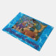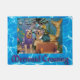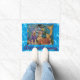 This door mat features golden retrievers in an under the sea scene. One golden retriever is dressed as a mermaid, perched on a treasure chest. The other golden is a purple octopus. The message reads, "Mermaid Crossing".