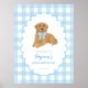 Welcome your guests in the sweetest way with this golden retriever first birthday welcome sign! Featuring an adorable golden retriever puppy with a blue gingham bow and matching chequered background, this personalised party poster adds the perfect touch of warmth and charm to your little one’s celebration.