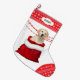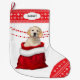 The front of this Holiday stocking shows an image of an adorable Golden Retriever puppy peeking out of a red and white Santa style gift bag. Behind the dog is a red beaded garland. The toe and top border are a red and white snowflake pattern. On the top border is a white label with your custom text in dark grey. The back of the stocking is the same red and white snowflake pattern.
