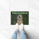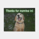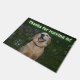This door mat features a golden retriever puppy in lots of bubbles. The message reads, "Thanks for popping in!".