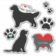 Here's a grouping of cute dog stickers! Designs feature black silhouettes of golden retrievers sitting and standing, paw prints, and the phrases "love is golden" and I love my golden retriever."