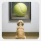 A golden retriever sits, staring at a picture frame containing a painting of a large tennis ball
