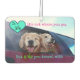 This air freshener features a photograph of two golden retriever dogs with their heads looking out a car window. The caption reads, "In life, it's not where you go, but who you travel with."