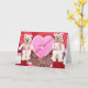 This Valentine’s Day card features golden retrievers dressed as white teddy bears with heart decorations. They are holding up the lid to a giant box of chocolates which is resting next to them, among all the Valentine gifts.