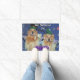 This doormat features golden retrievers dressed as fairies with wands in their mouths. The message reads "We believe in MAGIC".