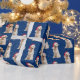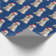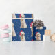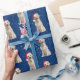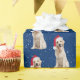 Golden retriever with Santa Claus cap on blue background with snowflakes.