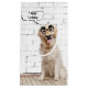 Golden retriever wearing a funny face mask on sketched brick wall and wood floor.
