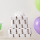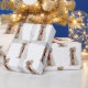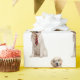 Cute Golden Retriever with black glasses and striped necktie on white background.