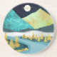 A beautiful landscape with unique textures showing a river and mountain landscape with a rising moon and starry sky in shades of blue, gold, dark green, and yellow.
