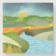 Abstract landscape scene of a river going under a stone bridge with rolling hills and a golden road in bold colours and textures.