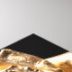 A single, meticulously crafted golden rose, gleaming against a black background. The details of the petals and leaves are sharply defined.