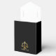 A favour box with an image of golden scales on a black background. Simple and elegant.