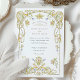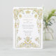 This elegant wedding invitation features a hand-drawn golden scroll frame adorned with delicate watercolor florals in blush, blue, peach, and sage tones. The ornate Rococo-inspired border curves gracefully around the text panel, incorporating stylised floral motifs and botanical accents for a sophisticated, storybook aesthetic.