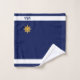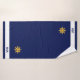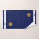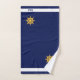 Elegant golden ship wheel on navy blue with editable text on a white stripe Bath Towel Set. Modern nautical towels. The image can be customised.