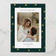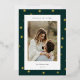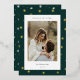 Share holiday greetings with these photo Christmas cards featuring your favourite photo set on a modern and minimal background of gold foil snowflakes on rich forest green. An editable message area lets you customise your holiday greeting in modern lettering. Add your family name or names beneath.