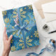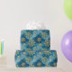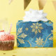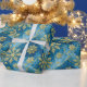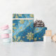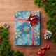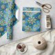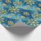 A field of golden snowflakes floats over a rich blue abstract background on this enchanting winter wrapping paper