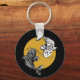 a decorative artwork of two monochromatic coloured koi carps swimming in circles on top of a big golden sun on a keychain.