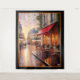 A cosy Parisian street scene is depicted at sunset, with warm light glowing from a cafe and reflecting on wet cobblestones. Rain-dusted tables and chairs line the quiet street, while trees and buildings form a charming backdrop. Read The Story At: https://xzendor7.com/golden-sunset-light-on-a-rainy-town-cafe-by-xzendor7/