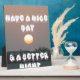 Charming Text: The phrase "Have a nice day and a better night" is elegantly displayed in fancy lettering, adding a touch of sophistication to the design.