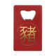 Golden pig Symbol with an embossed digital effect on dark red background. Design on card bottle opener. Available with other Chinese Zodiac signs. You can easily change background colour and size of the design by clicking the customise button. Matching charm bracelet, keychain, luggage tag, t-shirt, trucker hat and more..., Perfect for Chinese New Year of The Pig 2019 or Birthday (people born in Pig year). ------ "The Pig (豬) is the twelfth and the last sign of the Earthly Branches (亥). In the continuous Sexagenary cycle, every twelfth year corresponds to Hai, and is commonly called "the Year of the Pig" (豬年). There are five types of Pigs, named after the Chinese elements. In order, they are: Metal, Water, Wood, Fire, and Earth.