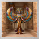 Add a touch of luxury to your home decor with a stunning digital artwork featuring a mythological Egyptian deity with vibrant, richly detailed wings. The figure is adorned in opulent gold and jewel-toned regalia, standing majestically within a temple hall covered in hieroglyphs. Ideal for enthusiasts of ancient Egyptian mythology and richly detailed fantasy art.