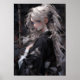 The woman is adorned in a classic black kimono, its fabric adorned with intricate patterns resembling wispy clouds drifting. The kimono, with its elegant silhouette and timeless design, drapes gracefully around her slender figure, enhancing her natural grace and poise. Its dark hue contrasts beautifully with the ethereal glow of her fair skin, creating a striking visual harmony.