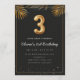Adorable 3rd birthday party invitation in a black and gold balloons design with golden tropical palm leaves. Customize with your party details and mail out to family and friends inviting them to celebrate the 3rd birthday with style!