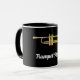 This mug features a music theme - an illustrated golden trumpet showing details of the instrument against a background whose colour you can change, and text that is customisable. Edit the background to fully customise the product.