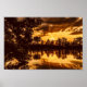 A warm, vivid, golden twilight sunset reflects in the ripples of the peaceful, flowing lake.