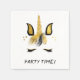 Sweet unicorn face with gold ears, mane, horn and stars.  "Party time" text can be left as-is or customised with a name or special message.