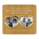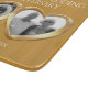 Customised golden wedding anniversary cutting board personalise with your parents photo, year of marriage and inside words. Example reads: Dearest Mum & Dad wishing you a wonderful 50th Golden Wedding Anniversary and your date. Double golden metal heart effect art and design by Sarah Trett for www.mylittleeden.com
