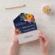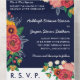 Charming floral all in one wedding invitation in navy blue with white fonts and colourful flower arrangements in golden yellow, pink, orange, and red with greenery and berries. The other side of the invitation, which will feature as an envelope, is white with another beautiful flower arrangement beneath the return address.