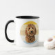 A portrait of a beautiful Goldendoodle Dog is the feature on this mug. The image is placed on a retro, slightly distressed gold, tan, and blue stripe sunset background, and printed twice on the mug. Your name is in black script between the images.