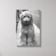 An adorable furry Goldendoodle puppy sitting on a backyard concrete walk along a brick wall in black and white.
