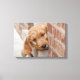 An adorable eleven week old Goldendoodle with bright eyes curiously peeks out from a doorway in a brick wall