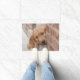 An adorable eleven week old Goldendoodle with bright eyes curiously peeks out from a doorway in a brick wall