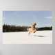 Enthusiastic goldendoodle runs happily through a field of fresh snow in late winter.