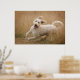 Goldendoodle, tongue out, ears flopping, runs through tall grass.