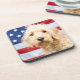 Goldendoodle sits proudly in front of the American flag on Memorial Day.